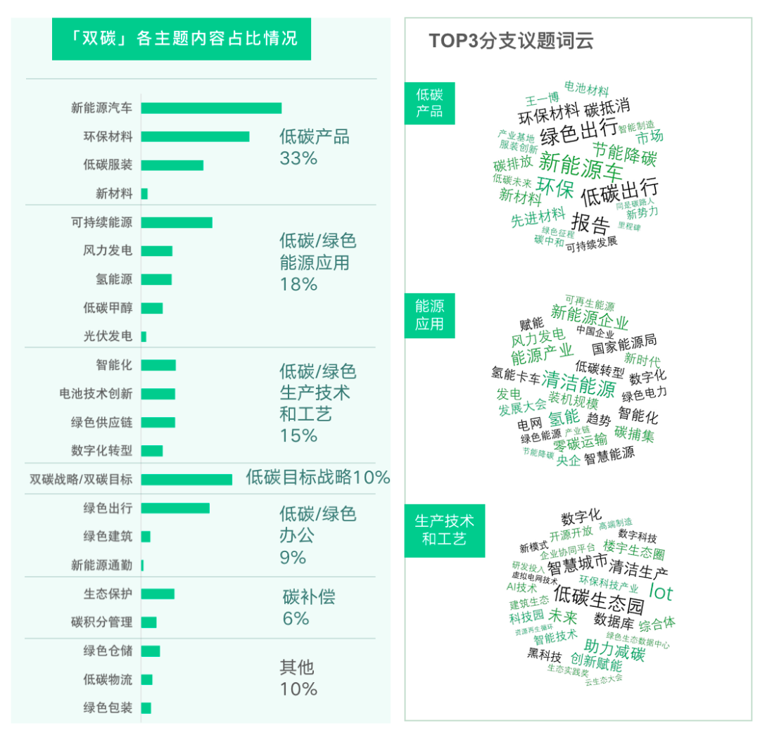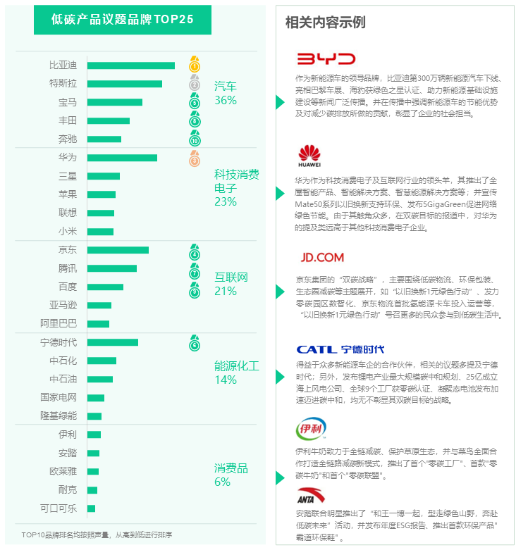 在双碳议题总声量中,汽车行业占了35%,在声量最大的分议题“低碳产品”声量排名中有五家汽车企业闯入了TOP10,其中两家新能源汽车品牌牢牢占据1、2名。在汽车行业,关于双碳传播的竞争已经白热化。