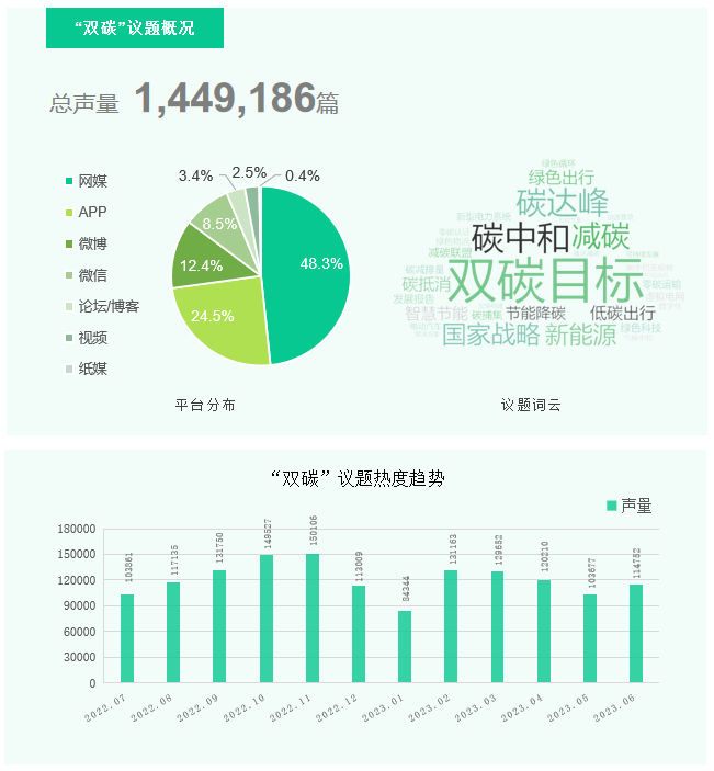 2022年7月至2023年6月,围绕“双碳”的企业传播声量近150万,且呈现一个相对均匀的分布趋势。